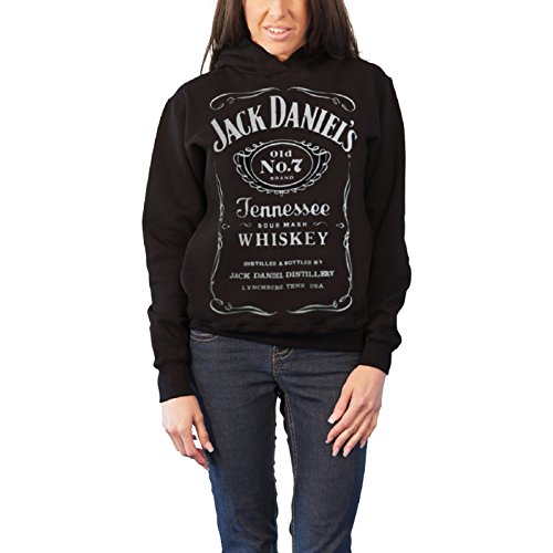 This hooded sweater for ladies is an absolute favorite . The sweater is black with a large front print of the Jack Daniel's logo with elegant JD framework. The sweater is made of 100% Cotton and is available in sizes S-XL.